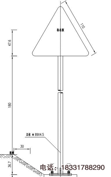 百分之八十以上的單柱式交通標志都是采用鋼管89mm制作,采用熱侵鍍鋅處理,常規(guī)尺寸立柱直徑φ89mm*厚度4.5mm*高度3000mm,基礎(chǔ)法蘭盤400mm*400mm*10mm,地腳螺栓M20*L=710mm。其他常見尺寸有φ76、114、121、140、152、165、180、194、219等都是單柱式標志桿的鋼管直徑,高度則根據(jù)公路規(guī)劃測量高度情況而定。一套標志桿是由立柱、底座法蘭盤、基礎(chǔ)法蘭盤、底座加勁肋、地腳螺栓、螺母、標志牌、抱箍、滑動槽、反光膜等材料組裝而成,基礎(chǔ)挖坑采用混凝土澆筑,一般5-7天則可安裝。